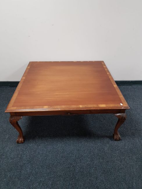 A square mahogany coffee table on claw and ball feet