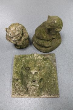 A weathered concrete lion mask plaque together with two garden figures of a gargoyle and a cat