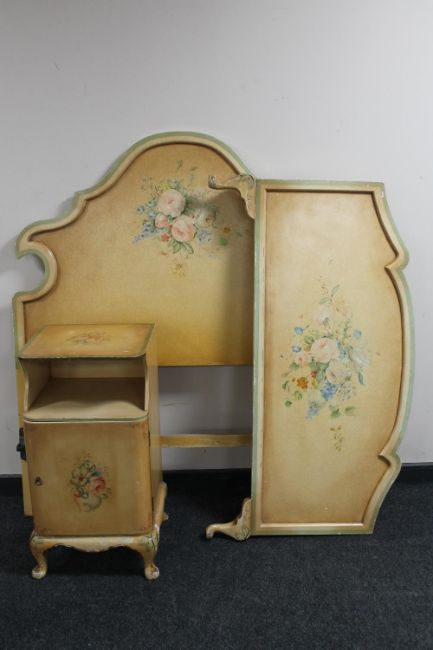 A 20th century five piece Queen Anne style bedroom suite comprising of dressing table with triple mirror and stool, 3'6 bed frame and bedside cabinet
