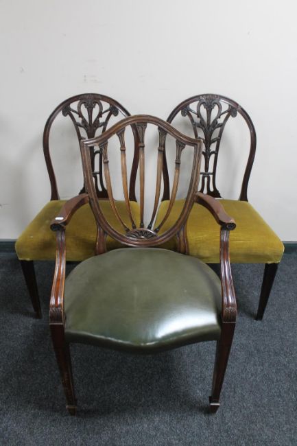 A pair of mahogany dining chairs and a further shield back armchair