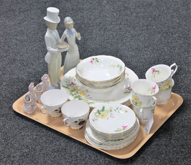 A tray of twenty-one pieces of Clementine tea and dinner ware, pair of Colclough teacups, two Spanish figures etc