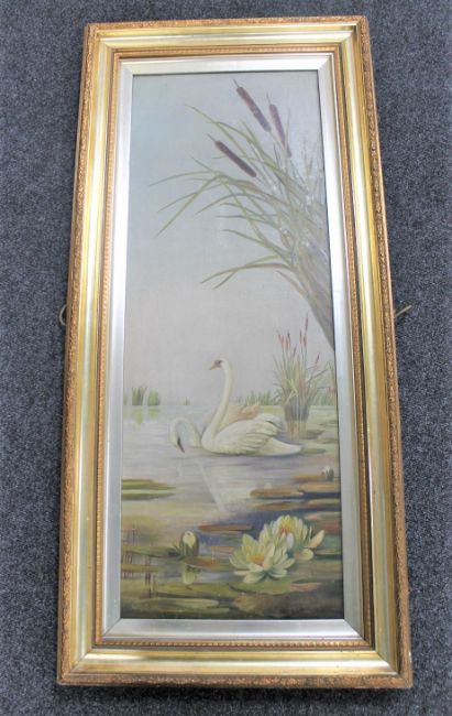An antique gilt framed oil on canvas - Two swans on pond