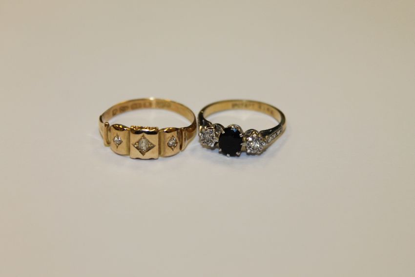 Two 18ct gold rings set with sapphire and diamonds (2)