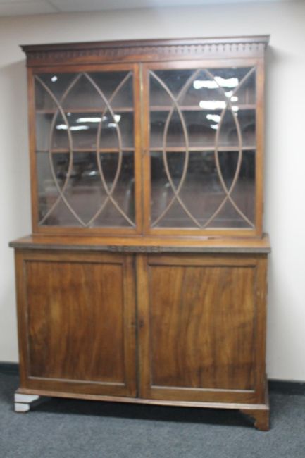 A Regency glazed mahogany double door bookcase fitted with cupboard beneath on bracket feet