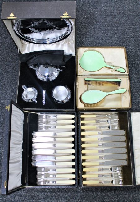 An Art Deco brush set, cased chrome tea service and two cases of fish cutlery