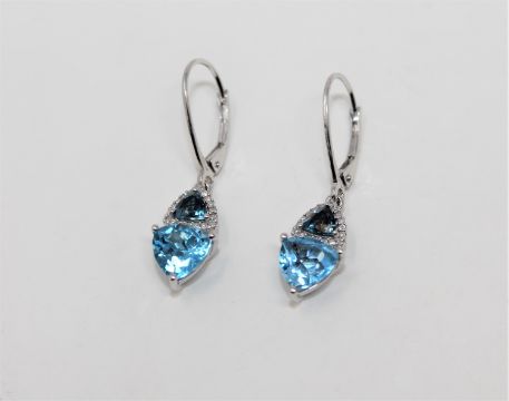 A pair of 10ct white gold blue topaz and diamond drop earrings, the trilliant-cut topaz having a total weight of 3.0 carats, the total diamond weight 0.22ct. With certification.