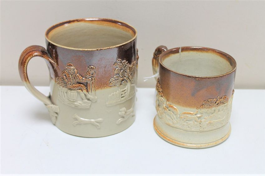 Two antique stoneware mugs depicting hunting and farming scenes. (2)