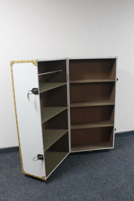 An early twentieth century canvas bound shipping trunk on castors fitted with shelves