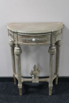 A reproduction demi lune hall table
