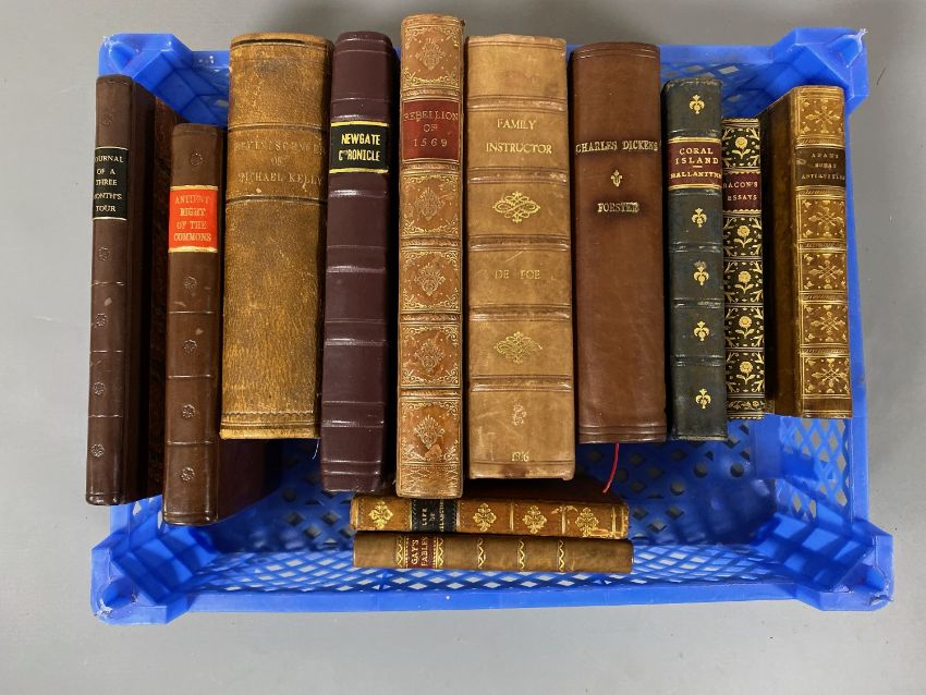 John Bowyer Nichols and Son, and William Pickering (Publisher) : Memorials of the Rebellion of 1569, a volume, hardcover, leather bound, 420 pages, printed by White and Carr of Sunderland, 1840, together with eleven further antiquarian volumes, all hardcovers, - The Fables by John Gay, The Life of Philip Melancthon - The German Reformer published by William Oliphant, Bacon's Essays and Colours of Good and Evil by W. Aldis Wright, Roman Antiquities or an Account of the Manners and Customs of the Romans by Alexander Adam, The Life of Charles Dickens by John Forster, The Coral Island by R. M. Ballantyne, A Journal of A Three Month's Tour by The Marchioness of Londonderry, The Ancient Right of the Commons of England by William Petyt, Reminiscences of Michael Kelly (Volume I only) published by Henry Colburn of London, The New and Complete Newdate Calendar by William Jackson (Volume III only) and The Family Instructor by Daniel De Foe. (12)