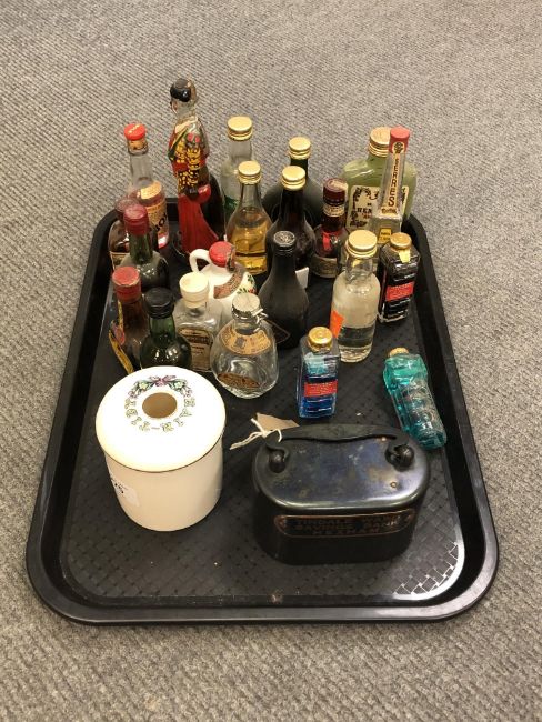 A W. H. Goss "Hexham" souvenir hair tidy pot, with pierced lid, together with a Tindale Ward Savings Bank of Hexham money box and a quantity of alcohol miniatures. (Q)