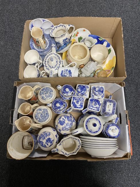 Two boxes of assorted china - Ringtons ware, willow pattern dinner ware, teapots etc