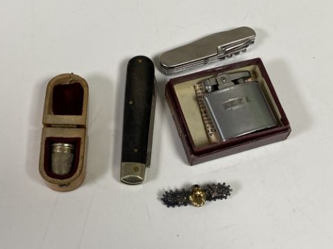 A Mauchline ware thimble case containing a Charles Horner silver thimble, together with two pocket knives, a boxed Ronson lighter and a Victorian silver brooch (5)