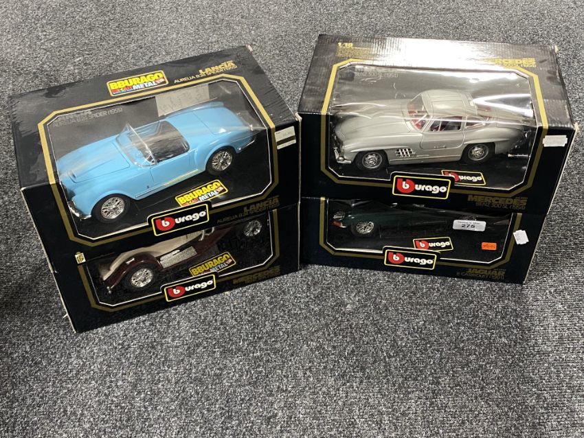 Four boxed Burago 1/18 scale die cast vehicles : Jaguar E Cabriolet, Lancier Spider, Mercedes Benz SK and a Mercedes Benz 300SL