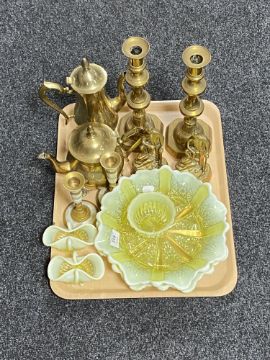 A tray of assorted brass ware - coffee pot, candlesticks, mining figures and five pieces of vaseline glass