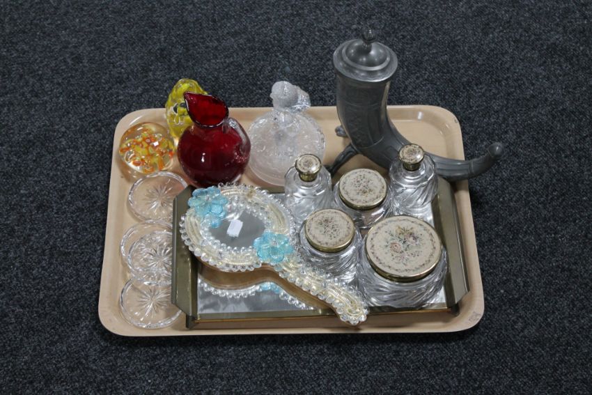 A tray of glass paperweights, Venetian glass hand mirror, glass trinket set, coin collection and a pewter horn lidded goblet