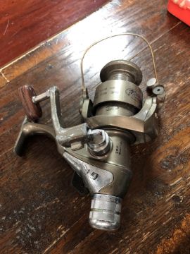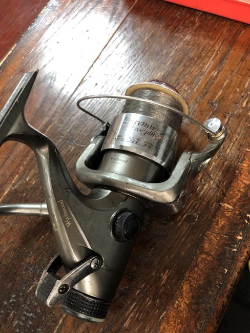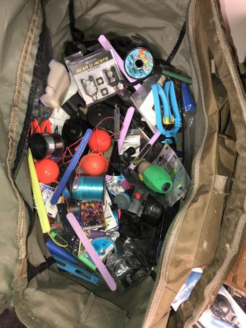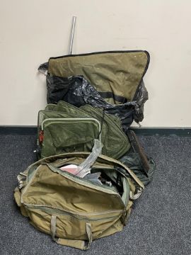 A fishing bag containing assorted accessories, reels, landing nets, keep nets etc
