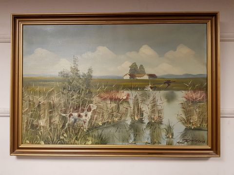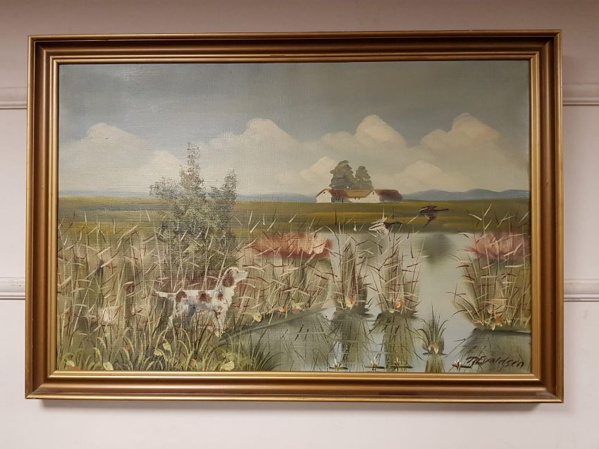 Continental school : Dog and ducks amongst reeds, oil on canvas, 95 cm x 62 cm