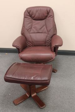 A brown leather relaxer armchair and stool
