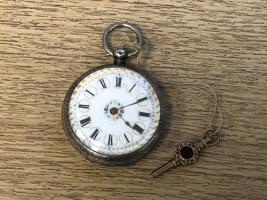 A continental silver fob watch with enamelled dial, with key