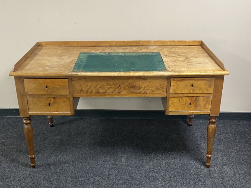 A continental satinwood five drawer desk with inset panel and gallery