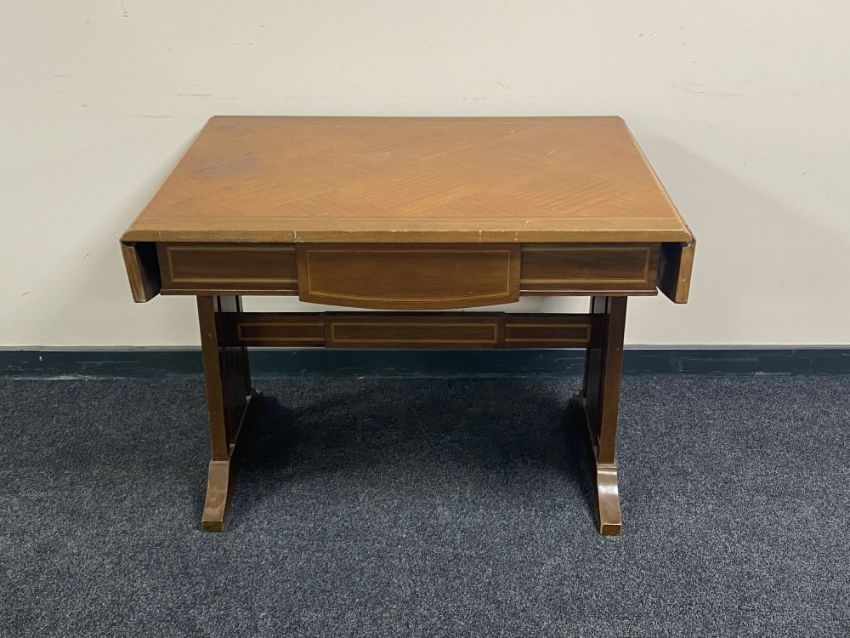 An antique inlaid mahogany flap sided sofa table