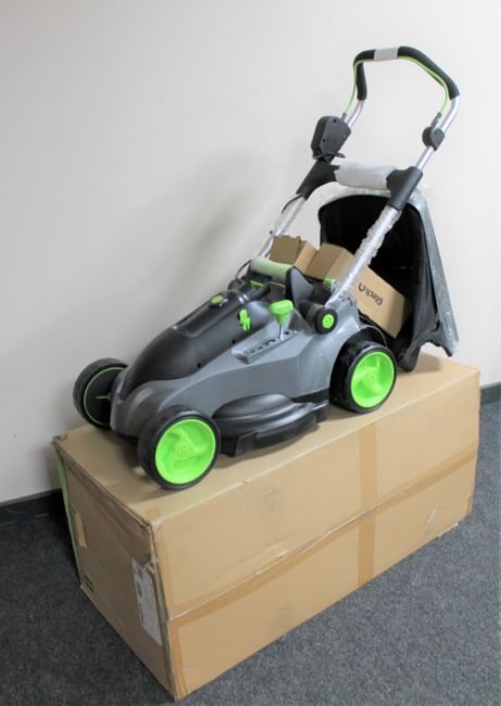 A G-Tech cordless electric lawn mower model number CLM001, with grass box, leads, battery in original retail box (as new)