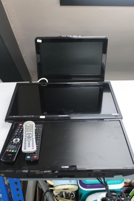 A Blaupunkt 24 inch LCD TV (no table stand), a Logik 22 inch LED TV (no table stand) and a Kammark 16 inch LCD/DVD, all with remote controls