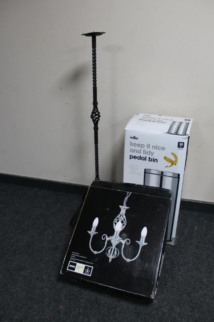 A boxed 30 litre chrome bin, boxed three candle pendant light fitting, wrought iron candle stick