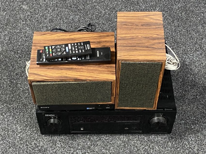 A Denon Avr-x520 BT AV surround receiver, Sony bluray player and a pair of mid 20th century speakers, with remotes (continental wiring)