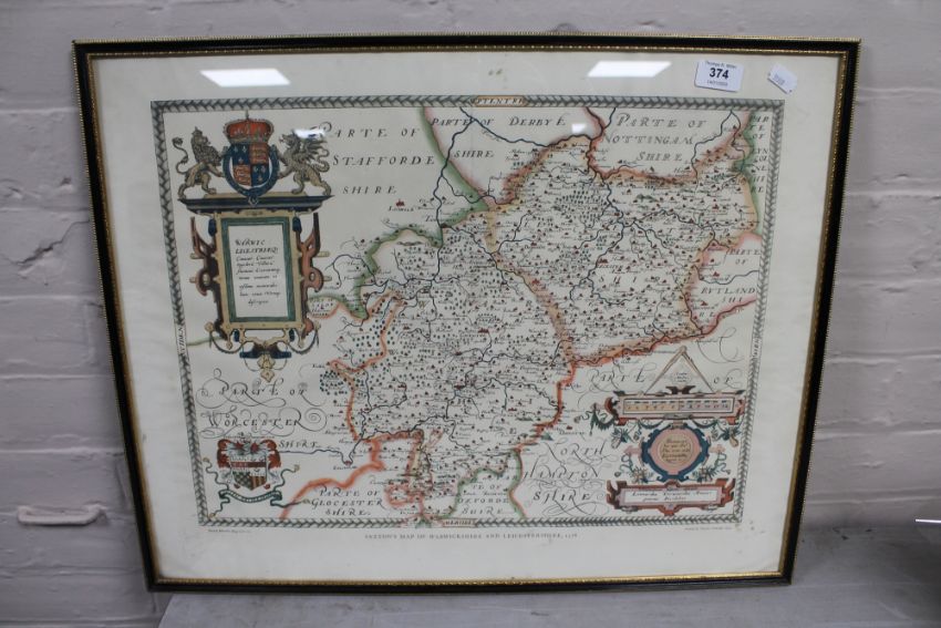 A framed Saxtons map of Leicestershire in 1576, in Hogarth frame, printed 1959