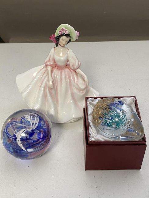 A Royal Doulton figure - Sunday Best, HN 2698 and two Isle of Wight paperweights