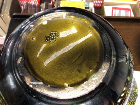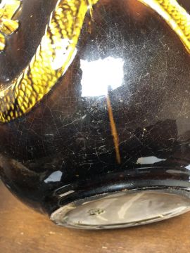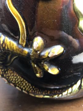 Heavily crazed. Numerous glazing flaws and bubbles. Minor losses to the dragon's claws and tail. Loss to one of the dragon's tail which has been filled and repainted. This is Bretby, not Burmantofts as previously catalogued.