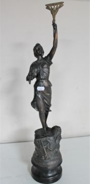 An antique spelter figure of a female with arm raised