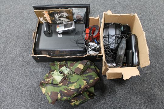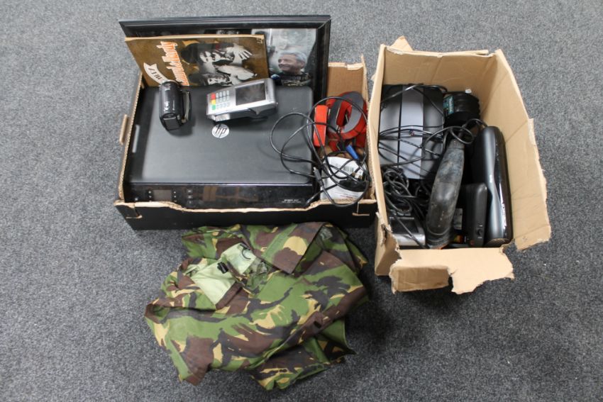 Two boxes of electricals - HP printer, Sky HD box, NUFC print, military jacket etc