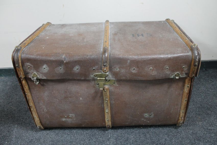 An antique bentwood bound travelling trunk
