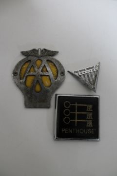 Three vintage car badges - AA, Ford and Penthouse together with a fuel system guide