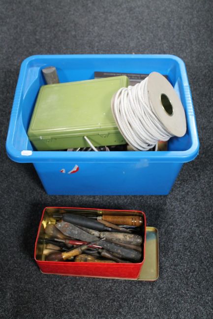 A box and tin of vintage hand tools
