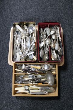 Two tins and a cutlery drawer of plated and stainless steel cutlery