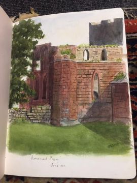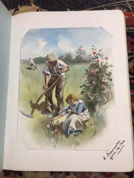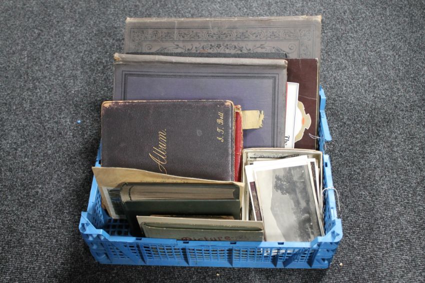 A box of antique and later postcards, antique sketch albums, photograph album etc