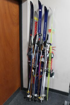Five assorted pairs of skis including Fischer, Rossignel Europa together with assorted ski poles