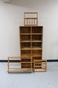 Two sets of pine open shelves, two magazine racks and a wall rack