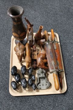 A tray of carved hardwood animal ornaments, pair of eastern carvers in sheath etc