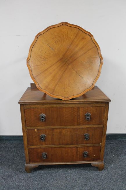 A 1930's walnut three drawer chest together with a walnut pie crust coffee table
