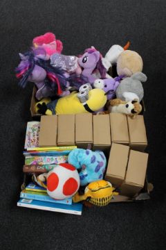 Two boxes of children's soft toys including Garfield, children's books and educational games