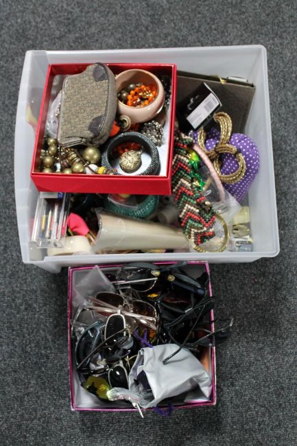 A crate of costume jewellery, paint brushes, further box of lady's sunglasses
