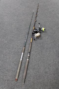 Two boat rods together with three reels - Mitchell 624 multiplier and two fixed spool reels