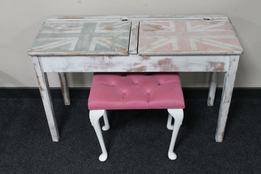 A mid 20th century painted shabby chic double child's desk and a pink upholstered stool