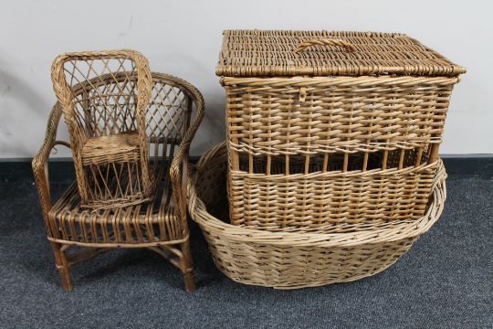A 20th century wicker log basket together with a wicker pigeon basket, bamboo and wicker child's chair, dolls chair