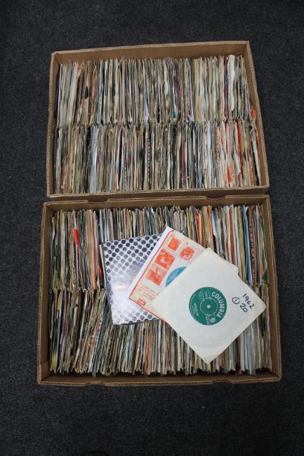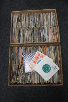 Two boxes of a large quantity of vinyl 7" singles, The Clash, Foo Fighters, Sham 69